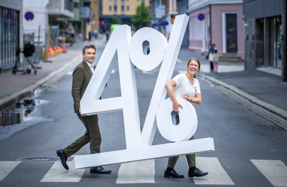 Før sommeren holdt MDG-leder Arild Hermstad (t.v.) og parlamentarisk leder Une Bastholm opp dette skiltet for å forklare partiets mål. I den nyeste partimålingen ser det ut til å være nådd og vel så det.