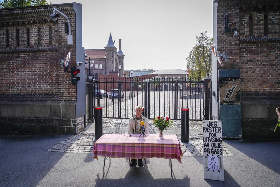 Vebjørn Bjelland Berg sultestreiker for utfasing av olje og gassproduksjon. Onsdag flyttet han protesten fra Eidsvolls plass til Statsministerens kontor. Foto: Jonas Fæste Laksekjøn / NTB