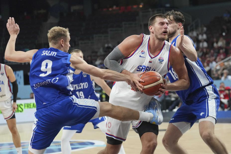 Finland brukte alle midler for å stoppe NBA-superstjernen Nikola Jokic og lyktes i sin sensasjonsseier over Serbia i EMs åttedelsfinale. Foto: Sergei Grits, AP / NTB
