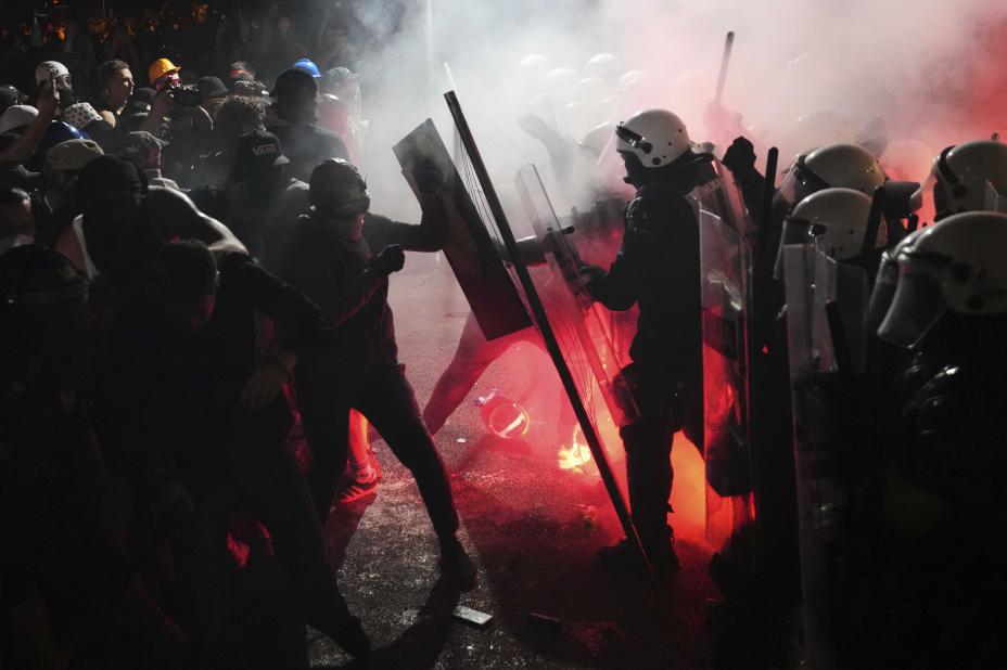 Demonstranter og politi støtte sammen i Novi Sad fredag kveld. Foto: Darko Vojinovic / AP / NTB