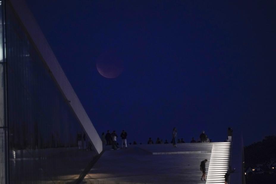 Bak et tynt skylag kunne man se måneformørkelsen over Operaen i Oslo søndag kveld. Foto: Ørn E. Borgen / NTB