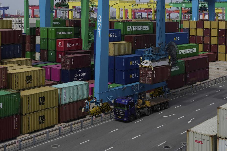 En kran laster konteinere på en havn i Tianjin i Kina i august. Foto: Mahesh Kumar A. / AP / NTB