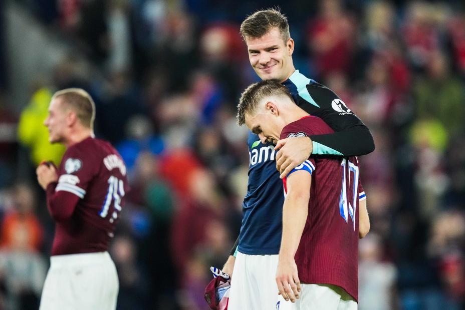 Alexander Sørloth og Martin Ødegaard nærmer seg VM-billett, men det tas med knusende ro. Foto: Fredrik Varfjell / NTB