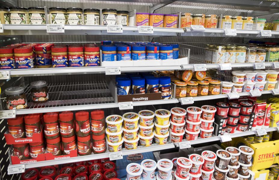Hyller med pålegg på Coop på Skøyen i Oslo. Nøtte kan skimtes helt til høyre i bildet.