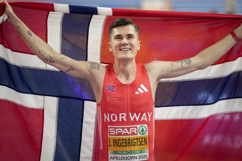 Jakob Asserson Ingebrigtsen da han vant 1500-meteren innendørs-EM tidligere i år. Han stiller til start på distansen i VM. Foto: Beate Oma Dahle / NTB