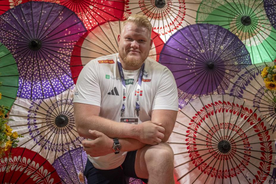 Kulestøter Marcus Thomsen før pressemøtet på utøverhotellet torsdag. Foto: Heiko Junge / NTB