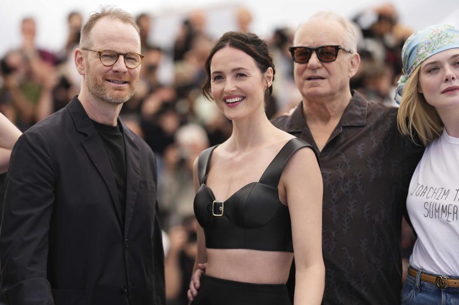 Joachim Trier har gjort inntrykk i Hollywood med filmen og sitt stjernelag, her Renate Reinsve, Stellan Skarsgård og Elle Fanning i Cannes. Foto: Scott A Garfitt/Invision/AP/NTB