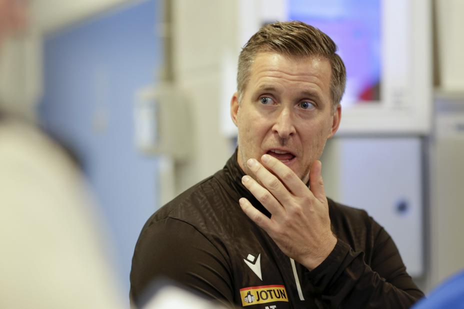 Sandefjord-trener Andreas Tegström var ikke med til Tromsø i cupen onsdag. Foto: Christoffer Andersen / NTB