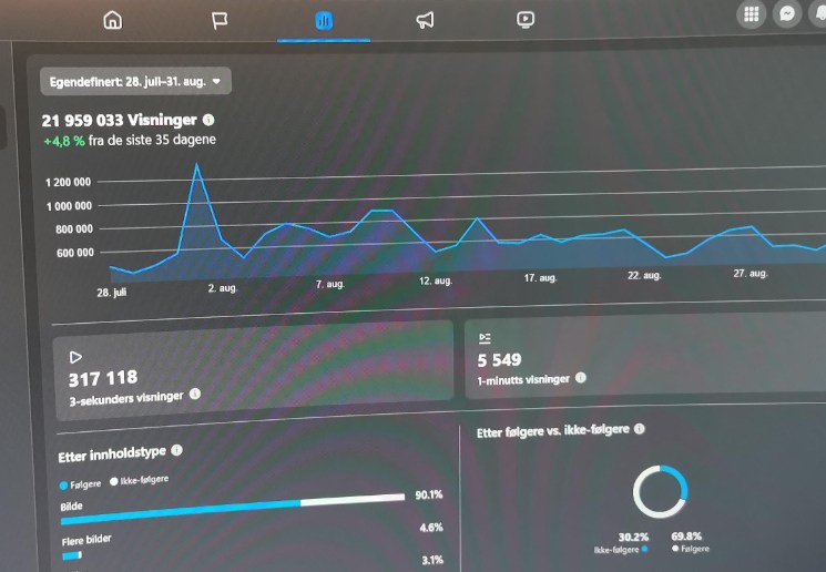 Til sammenligning hadde Aktuelt Haugalandet alene over 18 millioner visninger på 28 dager i august. Dette er egenrapporterte plattformtall (Facebook/Meta) og må forstås som impressions – altså antall visninger, ikke unike personer.
