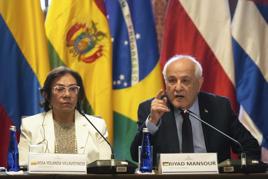 Colombias utenriksminister Rosa Yolanda Villavicencio (t.v.) kritiserer Trump og den store amerikanske militære tilstedeværelsen i området. Foto: Fernando Vergara / AP / NTB