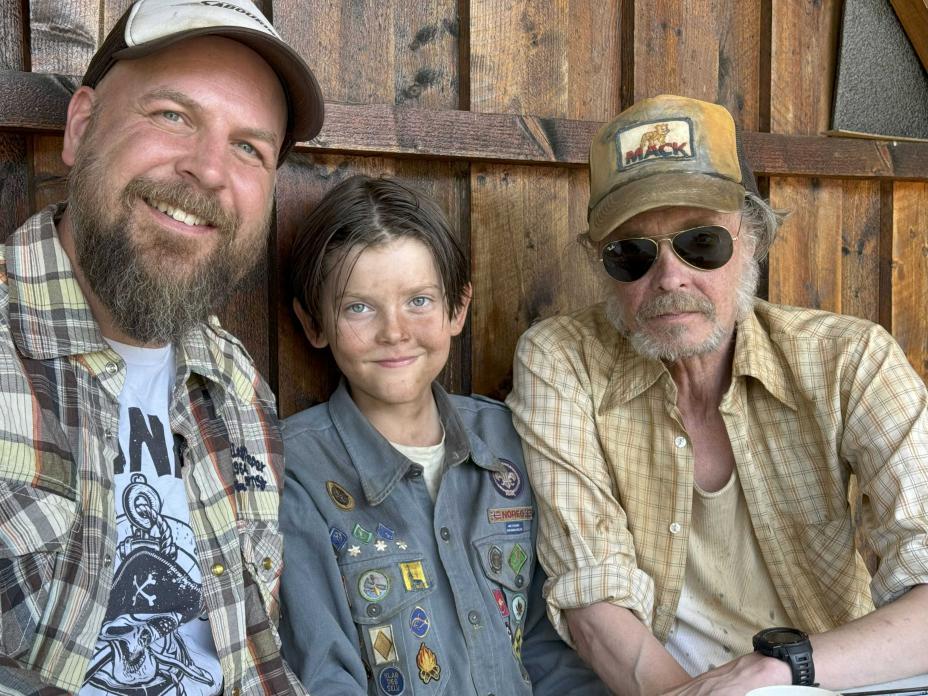 Regissør og manusforfatter for «Grevlingene», Paul M. Lundø, sammen med Nils Elias Lea Olsen, som spiller Bernt, og Johannes Joner som speiderleder. Foto: 73 Eyes Film Production / Handout / NTB