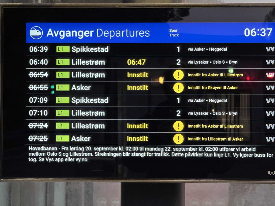 På Hovedbanen kjører L1 mellom Spikkestad og Lillestrøm. Bane Nor varsler at de vil komme med en ny oppdatering klokken 14, og sier de gjør det de kan for å løse problemet før helgerushet.
