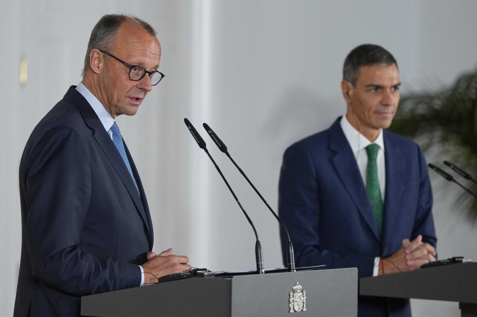 Mens Merz (t.v.) har vist lite vilje til å stramme til overfor Israel, har Sánchez tatt langt kraftigere grep for å legge press på den israelske regjeringen. Her fra torsdagens pressekonferanse i Madrid. Foto: Manu Fernandez / AP / NTB