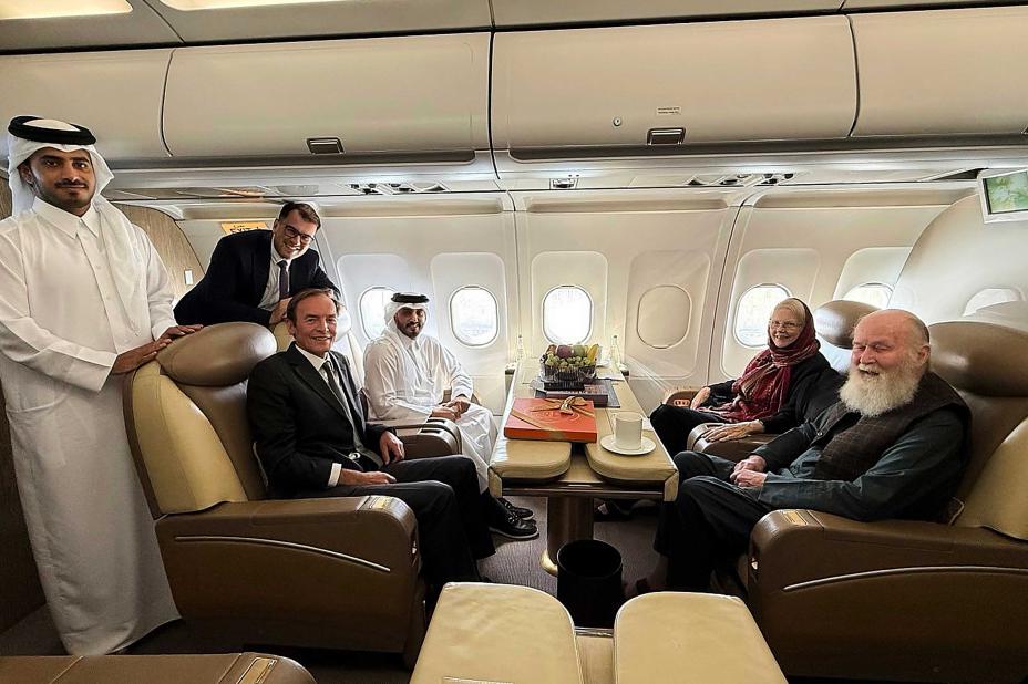 Det britiske paret Barbie og Peter Reynolds om bord i et fly på vei til Doha etter at de ble løslatt fra fengsel i Afghanistan. Foto: Qatars utenriksdepartement / AP / NTB