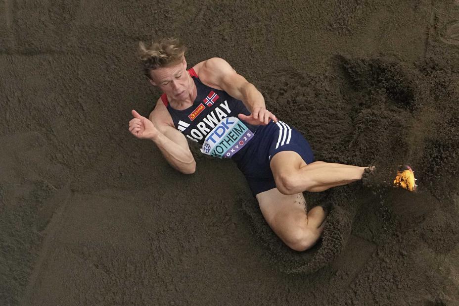 Sander Skotheim hoppet 7,97 meter i lengdehopp under friidretts-VM i Tokyo. Nordmannen ligger på 5.-plass etter tre øvelser. Foto: David J. Phillip / AP / NTB.