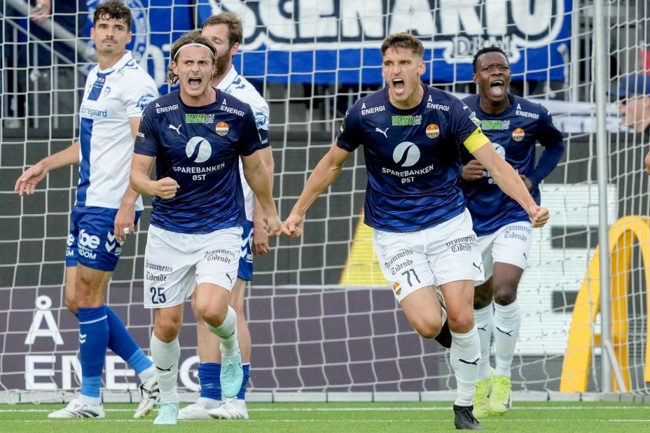 Strømsgodsets Gustav Valsvik (t.h.) jubler etter å ha scoret mot Sarpsborg. Foto: Fredrik Varfjell / NTB