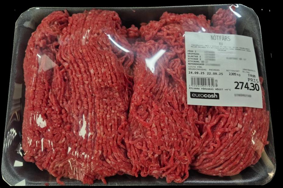 Eurocash i Töcksfors tilbakekaller storfekjøttdeig, blandingsdeig samt svinekjøttdeig etter at salmonella er påvist ved en rutinekontroll av kjøttråvaren fra leverandøren. Foto: Eurocash / Handout / NTB