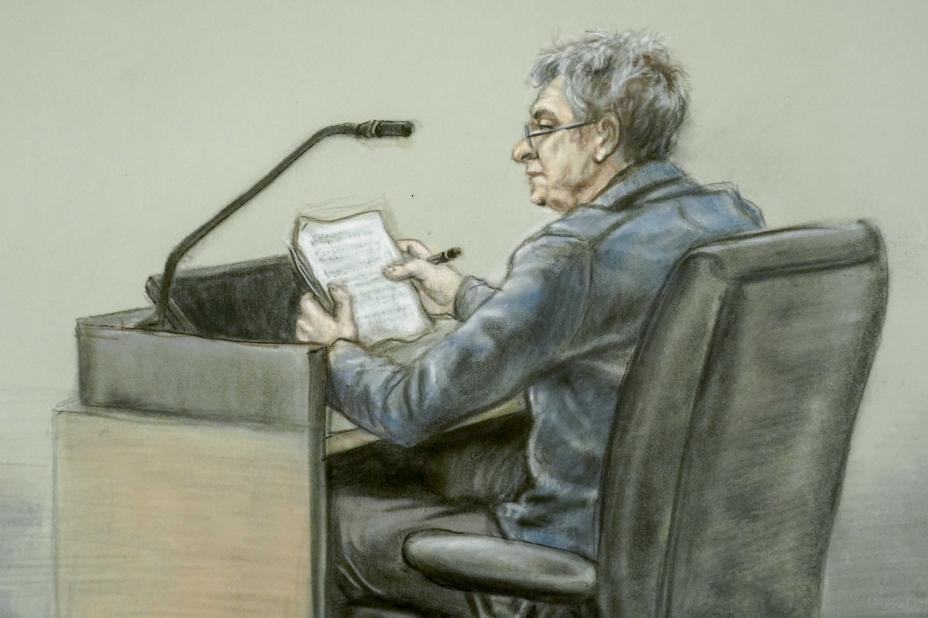 Tegning av den tidligere kommuneoverlegen Arne Bye på Frosta under straffesaken mot ham i Trøndelag tingrett. Foto: Ane Hem / NTB