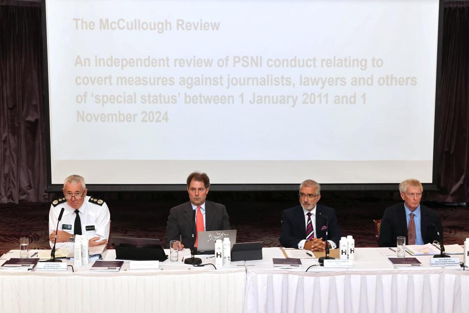 En uavhengig gransking har avdekket at politiet i Nord-Irland har drevet ulovlig overvåking av journalister og advokater. Rapporten ble bestilt av Nord-Irlands politisjef Jon Boutcher (t.v.) og granskingen ble ledet av advokaten Angus McCullough (nr. to fra venstre). Foto: PA / AP / NTB