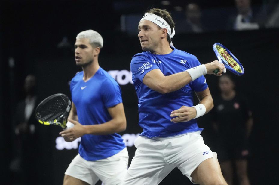 Casper Ruud i aksjon under Laver Cup nylig. Her i kamp sammen med Carlos Alcaraz. Foto: Jeff Chiu / AP / NTB