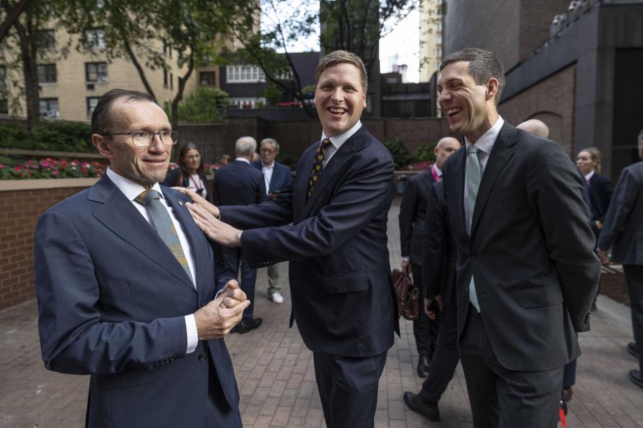 Utviklingsminister Åsmund Aukrust (midten) hadde med seg en ekstrabevilgning da han møtte ledelsen i FNs befolkningsfond torsdag. Møtet fant sted under FNs høynivåuke, der også utenriksminister Espen Barth Eide (t.v.) og klima- og miljøminister Andreas Bjelland Eriksen (t.h) har deltatt. Foto: Pontus Höök / NTB