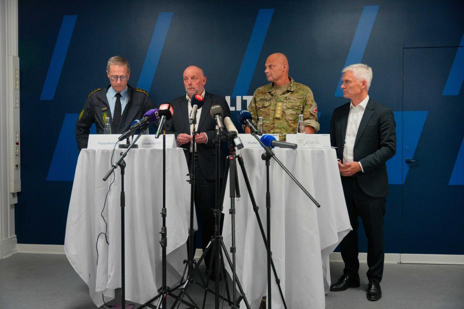 Uklart hvem som står bak dronene. Fra venstre, rikspolitisjef Thorkild Fogde, sjef for politiets etterretningstjeneste Finn Borch, forsvarssjef Michael Wiggers Hyldgaard og sjef for forsvarets etterretningstjeneste Thomas Ahrenkielattend på pressemøte torsdag kveld. Foto: AP / NTB