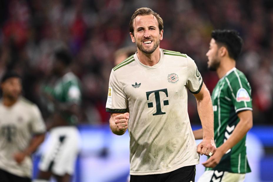 Harry Kane feirer etter å ha gjort sitt første mål for kvelden i Bayern Münchens seier over Werder Bremen. Foto: Harry Langer / DPA / AP / NTB