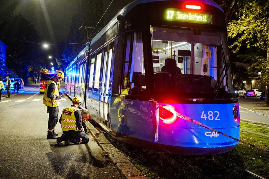En person ble påkjørt av trikken ved Adamstuen i Oslo søndag kveld. Foto: Terje Pedersen / NTB