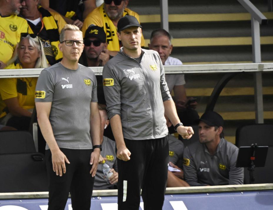 Karl Marius Aksum fra Narvik (t.h.) er en del av Mjällbys trenerteam. Søndag så han laget ta nok et steg mot en sensasjonelt seriegull. Foto: Johan Nilsson / TT / NTB