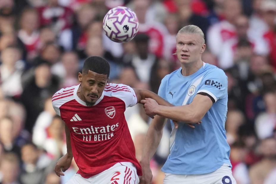 Arsenals William Saliba i kamp mot Manchester Citys Erling Braut Haaland i Premier League 21. september. Foto: Kin Cheung / AP / NTB.