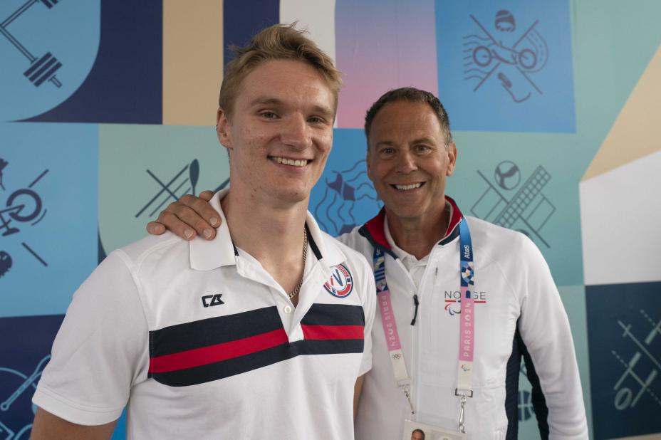 Para-friidrettsutøver Vegard Sverd (t.v.) hoppet inn VM-bronse i India. Her er han med trener Stephan Johansson i paralympics i fjor.