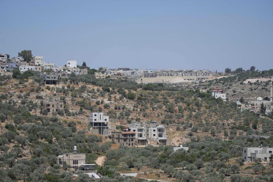 Den israelske bosetningen Bruchin regnes som ulovlig etter folkeretten, da den er på den okkuperte Vestbredden. Ved siden av ligger den palestinske landsbyen Bruqin. Foto: Nasser Nasser / AP / NTB