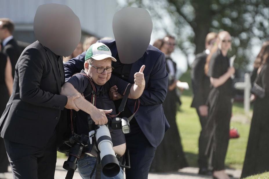 Andreas Fadum, fotograf fra Se og Hør ble fjernet av sikkerhetsvakter utenfor Gjerdrum kirke da Martin Ødegaard og Helene Spilling giftet seg i juni. Foto: Thomas Fure / NTB