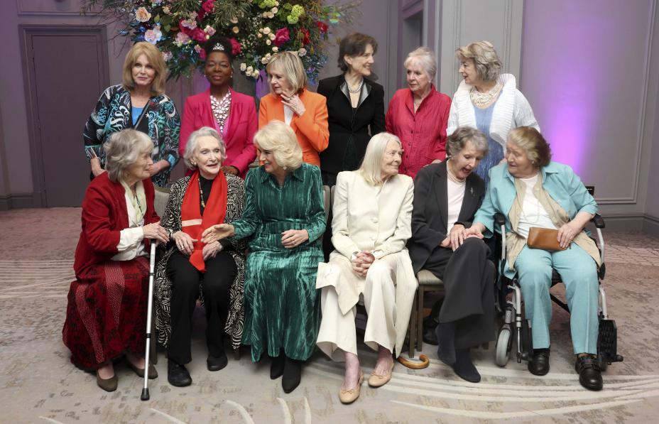 Patricia Routledge, foran helt til høyre, er død, 96 år gammel. Her er hun avbildet i godt selskap med blant andre Storbritannias dronning Camilla, Judi Dench, Joanna Lumley og Twiggy ved et arrangement ved Grosvenor House i London i 2024. Foto: Chris Jackson / AP / NTB