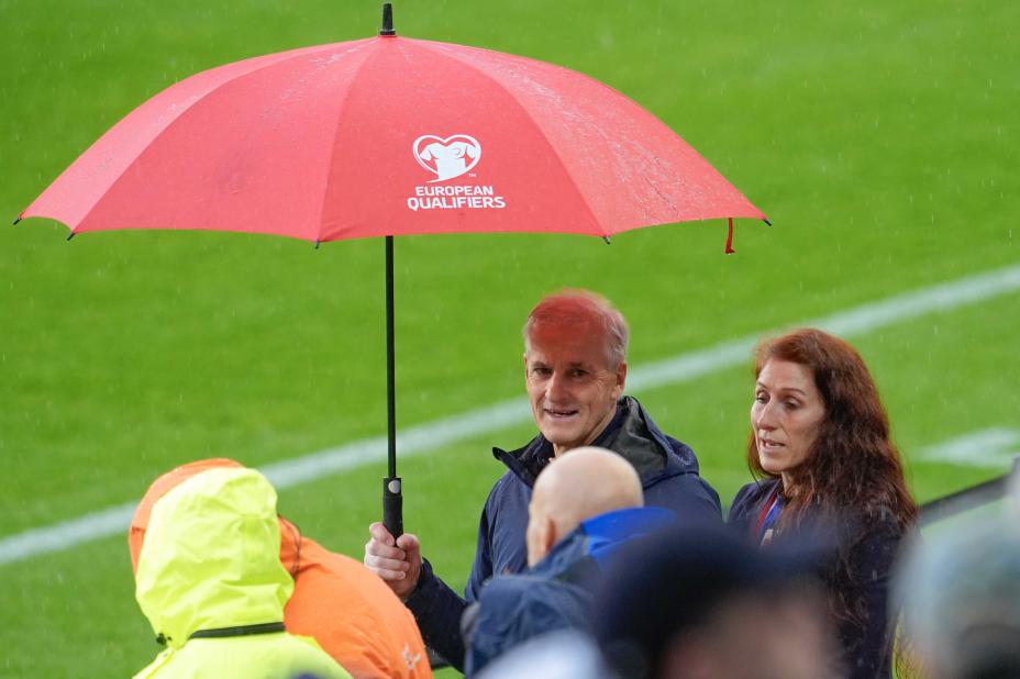 Statsminister Jonas Gahr Støre (Ap) skal legge fram planen for utfasing av gummigranulat til mandag. Fotballpresident Lise Klaveness vil også være til stede. Her er de sammen under Norges VM-kvalifiseringskamp mot Italia tidligere i år.