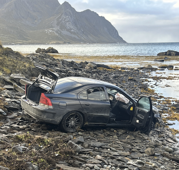 Lofotposten har publisert bilder av bilen der vannstanden har steget og fronthjulene er ute i vannet.