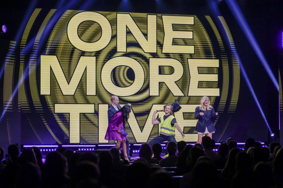 Aslak Maurstad og Siri Nilminie Avlesen-Østli i prat med de nye «Skal vi danse»-deltakerne Viggo Venn og Tale Torp Torjussen under TV 2s presentasjon av høstens tv-programmer i Grieghallen. Lørdag var danserne i aksjon – til rekordhøye seertall.