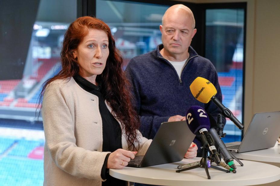NFF-toppene Lise Klaveness og Karl-Petter Løken på pressekonferanse foran VM-kvalifiseringskampen mot Israel.