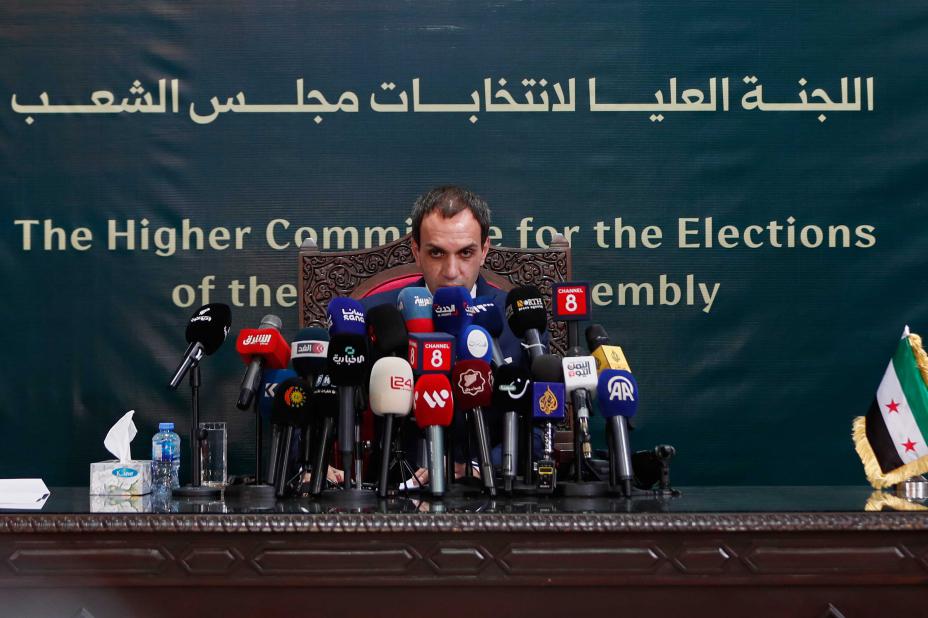 Talspersonen for valgkommisjonen, Nawwar Nejmeh, kunngjør de endelige resultatene av Syrias første parlamentsvalg siden tidligere president Bashar al-Assad ble styrtet. Foto: Omar Sanadiki / AP / NTB