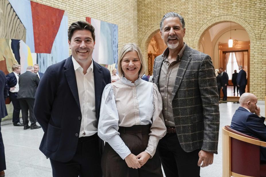 Venstres nye stortingsgruppe består av Grunde Almeland, partileder Guri Melby og nestleder Abid Raja. Foto: Jonas Fæste Laksekjøn / NTB