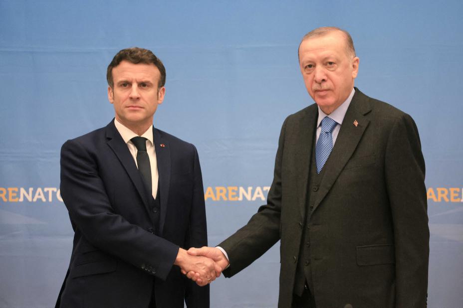 Frankrikes president Emmanuel Macron og Tyrkias president Recep Tayyip Erdogan sier de er klare til å bidra til å overvåke en eventuell fred i Gaza. Bildet er tatt i 2022. Foto: Wolfgang Rattay / AP / NTB