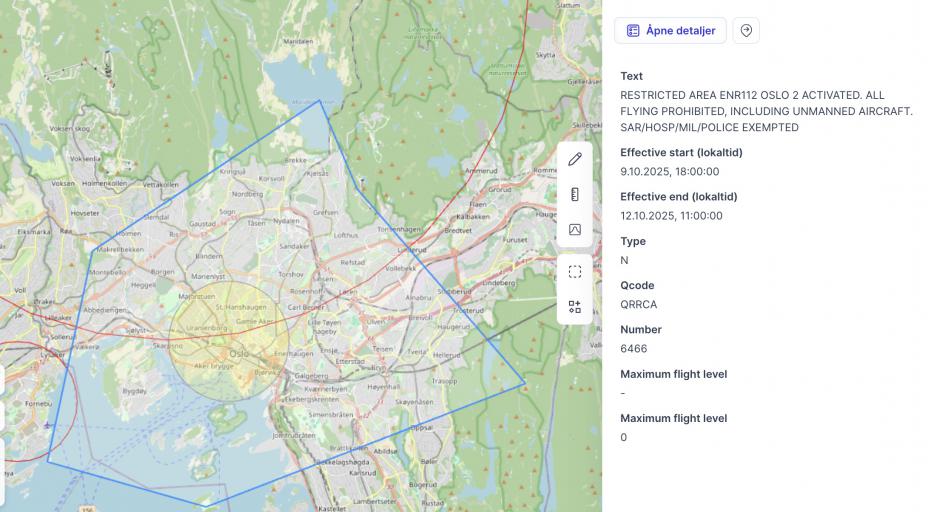 Skjermbilde som viser utvidede restriksjonsområdet over store deler av Oslo, som er innført i forbindelse fotball-landskampen mot Israel på Ullevål stadion lørdag. Foto: Skjermkopi Safetofly / NTB