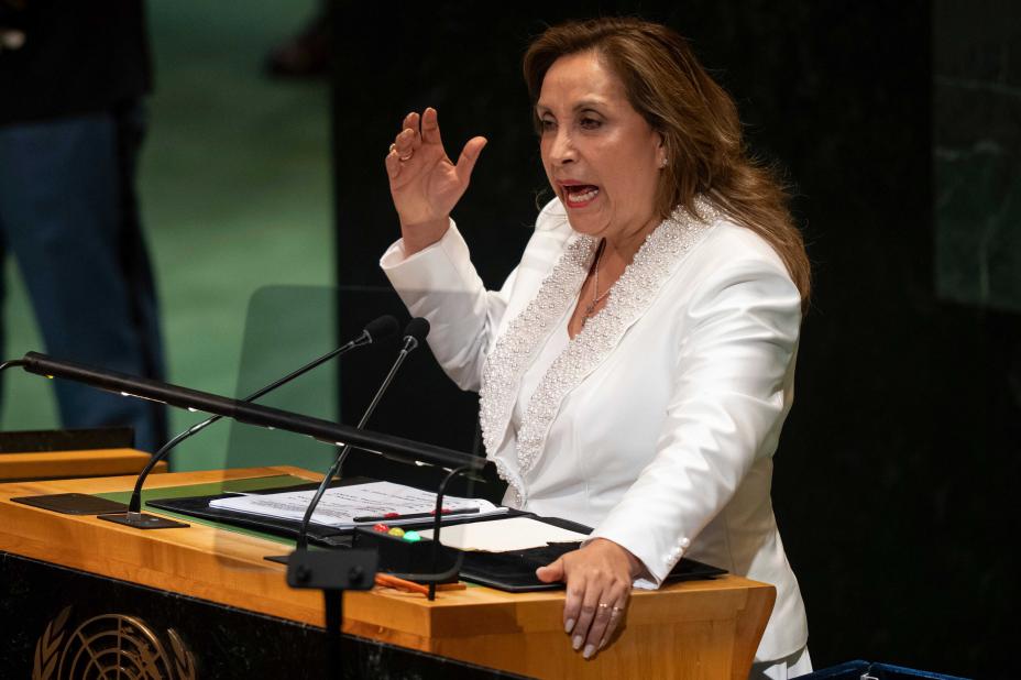 Peru president Dina Boluarte taler i FNs hovedforsamling i september. Foto: Yuki Iwamura / AP / NTB