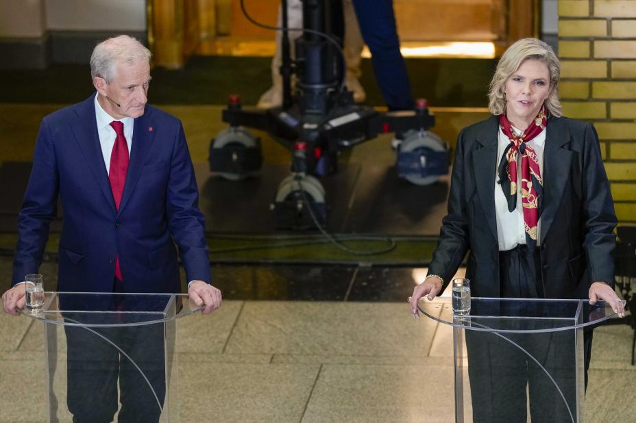 Nå krymper avstanden mellom Arbeiderpariet og Frp. Samtidig øker begge oppslutningen etter valget. Her ser vi Jonas Gahr Støre og Sylvi Listhaug under partilederrunden etter høstens stortingsvalg. Foto: Rodrigo Freitas / NTB