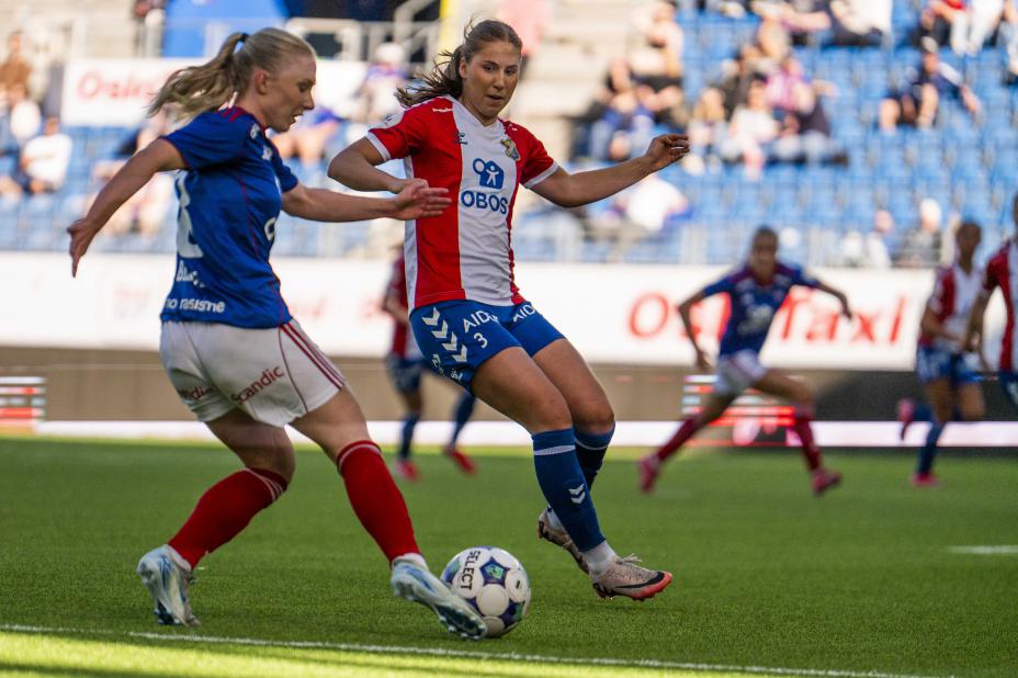 Lyns Maria Fink (t.v.) scoret mål mot Kolbotn. Her fra en tidligere kamp mot Vålerenga.