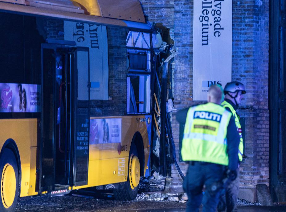 Ulykker og naturkatastrofer: Kuns seks personer slapp fra ulykken uskadet. I hovedsak var passasjerene unge voksne på vei hjem fra byen. Krysset Østre Voldgade/Sølvgade er stengt for trafikk og bygget må avstives før bussen kan fjernes.
