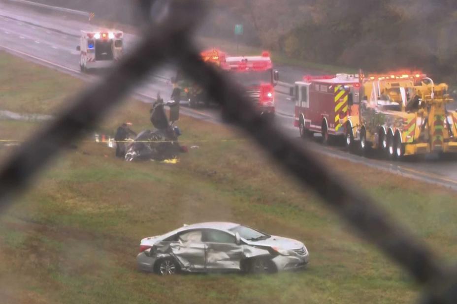Et småfly styrtet på en motorvei i delstaten Massachusetts i USA mandag. Begge de to som var om bord, omkom. En person på bakken ble skadet. Foto: WCVB-TV via AP / NTB
