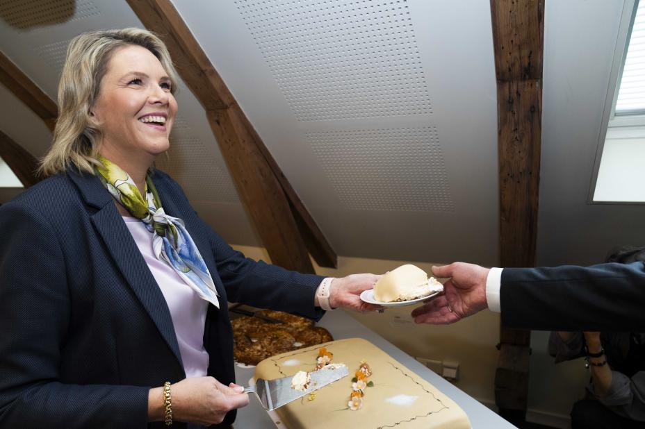 Fremskrittspartiets leder, Sylvi Listhaug, delte ut kake på Stortingets første samling etter valget. Foto: Jonas Fæste Laksekjøn / NTB