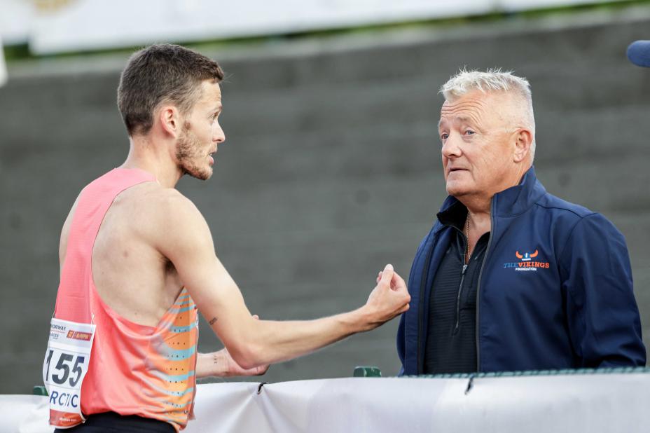 José Carlos Pinto fra Portugal (t.v.) og trener Gjert Ingebrigtsen (t.h.) under Trond Mohn Games på Fana stadion i Bergen tidligere i år.