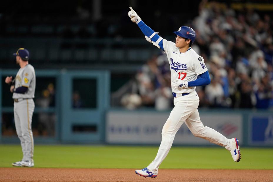 Shohei Ohtani jubler mens han runder basene etter en av sine tre homeruns da Los Angeles Dodgers slo Milwaukee Brewers og tok seg til World Series. Foto: Ashley Landis, AP / NTB